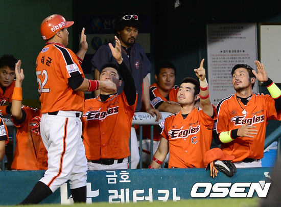 2일 오후 서울 잠실구장에서 열린 '2012 팔도 프로야구' LG 트윈스와 한화 이글스의 경기 4회초 1사 2,3루 이양기의 1타점 적시타에 홈을 밟은 김태균이 덕아웃에서 동료들과 하이파이브를 하고 있다.