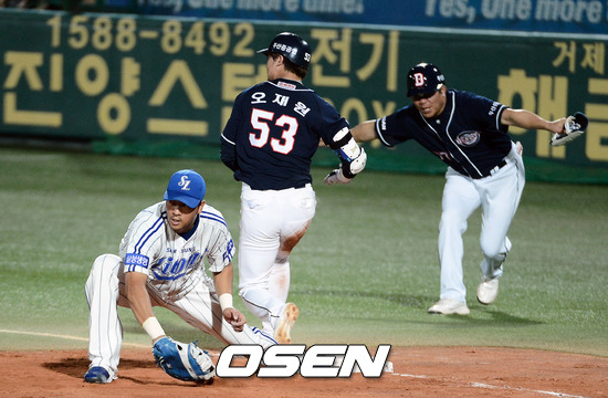 2일 대구구장에서 열린 '2012 팔도 프로야구' 삼성 라이온즈와 두산 베어스 경기 5회초 1사 1루 오재원 보내기 번트를 하고 1루에 세이프 되고 있다.