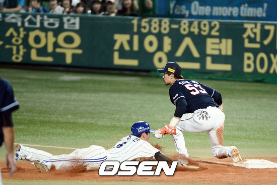 2일 대구구장에서 열린 '2012 팔도 프로야구' 삼성 라이온즈와 두산 베어스 경기 5회말 1사 1루 김상수 2루수 라인드라이브 아웃때 1루 주자 손주인 1루로 귀루하였으나 포스아웃 처리되고 있다.