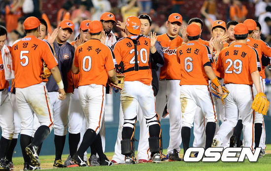 2일 오후 서울 잠실구장에서 열린 '2012 팔도 프로야구' LG 트윈스와 한화 이글스의 경기 종료 후 한화 선수들이 하이파이브를 하고 있다.