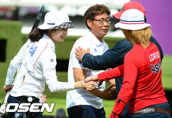 결승진출을 확정한 기보배가 로릭과 악수를 나누고 있다. /jpnews@osen.co.kr