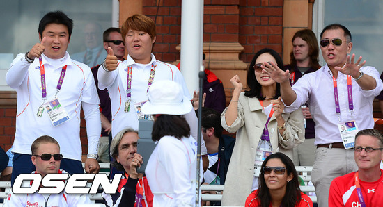 기보배가 결승진출하자 남자양궁대표 김법민과 오진혁이 기보배에게 엄지손가락을 보이고 있다./jpnews@osen.co.kr