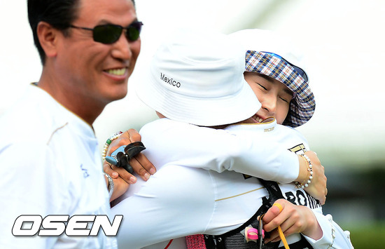 금메달이 확정된 기보배가 로만과 포옹을 하고 있다./jpnews@osen.co.kr