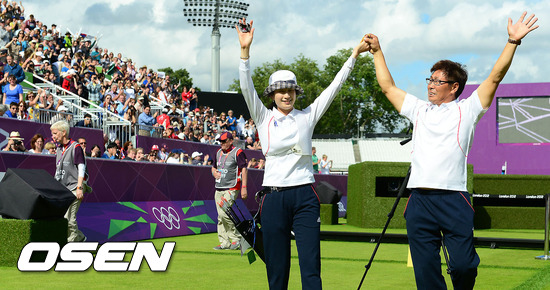 기보배가 금메달 확정 후 백웅기 감독과 손을 들어 팬들에게 인사를 하고 있다./jpnews@osen.co.kr