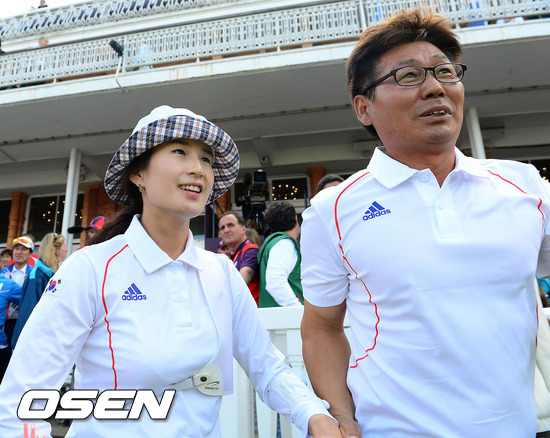 기보배가 금메달 확정 후 백웅기 감독과 손을 들어 팬들에게 인사를 하고 있다./jpnews@osen.co.kr