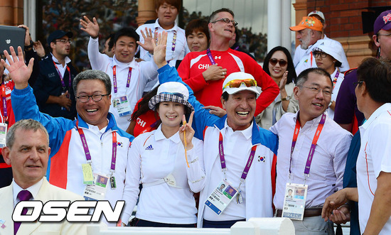 기보배가 시상식을 마친 후 코칭스태프 및 정의선 대한양궁협회장(오른쪽)과 포즈를 취하고 있다./jpnews@osen.co.kr