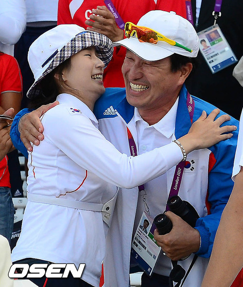기보배가 시상식을 마친후 장영술 총감독과 포옹을 하고 있다./jpnews@osen.co.kr