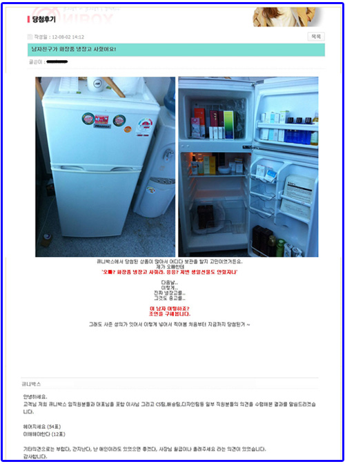 최근 여성의류쇼핑몰 큐니걸스(http://www.qng.co.kr/)의 이벤트사이트 ‘큐니박스’ 당첨후기 게시판에는 ‘남자친구가 화장품 냉장고 사줬어요’라는 제목으로 게시물이 올라왔다. 이 게시물은 각종 온라인 유머게시판에서 확산되며, 네티즌들에게 웃음을 선사하고 있다.