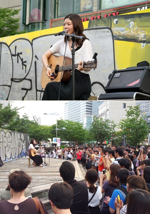 장재인은 지난 1일 미니앨범 '여름밤' 발매 기념으로 서울 홍대 걷고싶은거리광장과 여의도 한강공원 물밫광장 에서 거리공연을 가졌다.