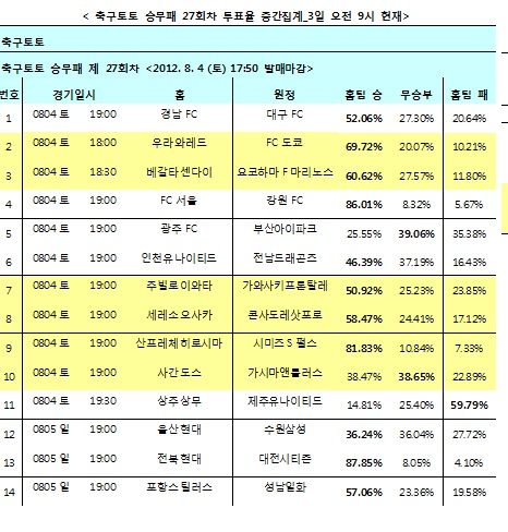축구토토 승무패 27회차 투표율 중간집계 결과