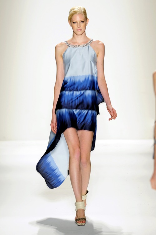 앞부분은 짧고 뒷부분으로 갈수록 길어지는 비대칭 디자인에 러플 디자인이 돋보이는 3단 캉캉 드레스로, 바다를 물들인 듯한 그러데이션이 되어 있어 바닷가에 딱 맞는 화사한 마린 룩이 완성됐다. 목 부분은 뱀 가죽 프린트가 되어 있어 이국적이면서도 화려하다.