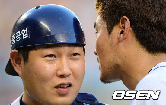 3일 오후 서울 잠실야구장에서 열린 '2012 팔도 프로야구' 두산 베어스와 KIA 타이거즈의 경기, 3회초 2사 2루 KIA 김원섭을 외야플라이로 처리한 두산 노경은이 더그아웃으로 가며 포수 양의지와 이야기를 나누고 있다.