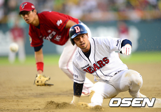 3일 오후 서울 잠실야구장에서 열린 '2012 팔도 프로야구' 두산 베어스와 KIA 타이거즈의 경기, 3회말 1사 1루 두산 김현수 외야플라이때 2루로 쇄도하다 급히 귀루한 1루주자 오재원이 KIA 유격수 김선빈의 송구 실책으로 인해 빠지는 공을 바라보고 있다.