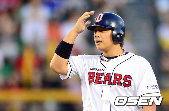 3일 오후 서울 잠실야구장에서 열린 '2012 팔도 프로야구' 두산 베어스와 KIA 타이거즈의 경기, 3회초 2사 2루 두산 윤석민이 좌중간 적시 2루타를 치고 타임을 외치고 있다.