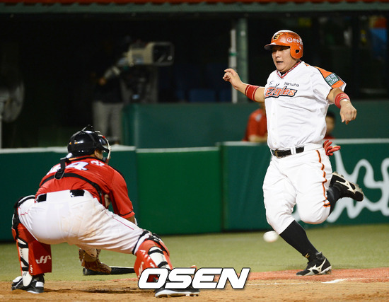 3일 대전구장에서 열린 '2012 팔도 프로야구' 한하 이글스와 SK 와이번스 경기 4회말 2사 1,2루 이대수 좌익수 앞에 떨어지는 안타때 2루 주자 김태균 홈까지 뛰어들었으나 SK 조인성 포수에게 태그아웃 처리되고 있다.