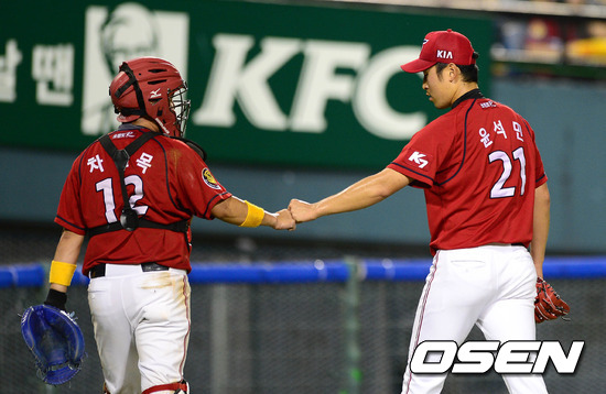3일 오후 서울 잠실야구장에서 열린 '2012 팔도 프로야구' 두산 베어스와 KIA 타이거즈의 경기, 6회말 2사 1루 두산 임재철을 내야땅볼로 처리한 KIA 윤석민이 더그아웃으로 가며 포수 차일목과 하이파이브를 하고 있다.