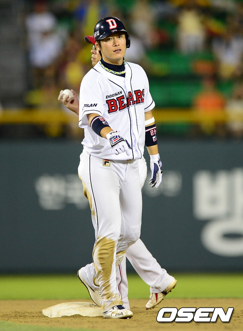 3일 오후 서울 잠실야구장에서 열린 '2012 팔도 프로야구' 두산 베어스와 KIA 타이거즈의 경기, 8회말 2사 3루 두산 이원석이 좌전 적시타를 치고 타임을 외치고 있다.