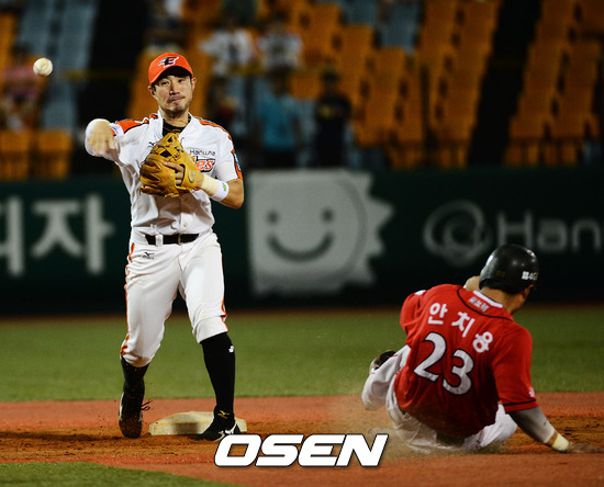 3일 대전구장에서 열린 '2012 팔도 프로야구' 한하 이글스와 SK 와이번스 경기 7회초 1사 만루 조인성 내야땅볼때 한화 한상훈 2루수가 1루 주자 안치용을 2루에서 포스아웃 시키며 1루에 송구 병살아웃을 시키고 있다.