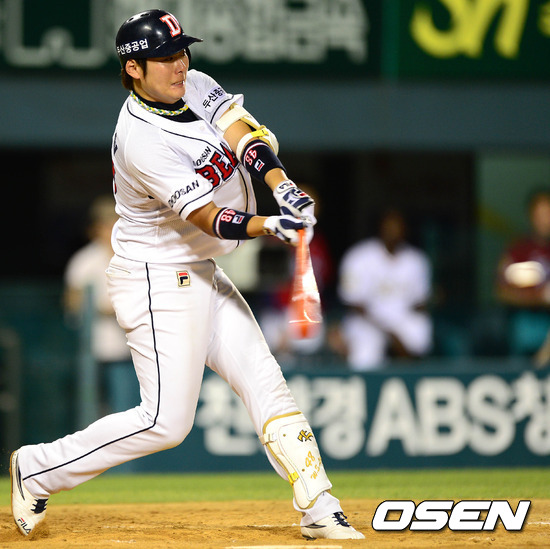 3일 오후 서울 잠실야구장에서 열린 '2012 팔도 프로야구' 두산 베어스와 KIA 타이거즈의 경기, 8회말 2사 3루 두산 이원석이 좌전 적시타를 치고 있다.