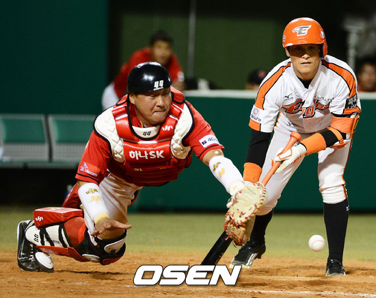 3일 대전구장에서 열린 '2012 팔도 프로야구' 한하 이글스와 SK 와이번스 경기 7회말 무사 1,2루 이대수 보내기번트때 공이 홈플레트 근처에서 공이 떠오르자 SK 조인성 포수가 다이빙캐치를 하였으나 파울이 되고 있다.