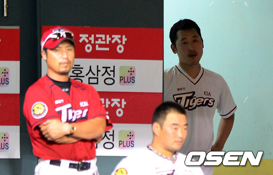 3일 오후 서울 잠실야구장에서 열린 '2012 팔도 프로야구' 두산 베어스와 KIA 타이거즈의 경기, 9회말 1사 1루 KIA 윤석민이 더그아웃에서 경기를 바라보고 있다.