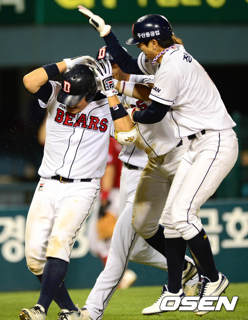 9회말 1사 1,2루 끝내기 2루타를 친 두산 양의지가 동료들에게 축하를 받고 있다. / sunday@osen.co.kr