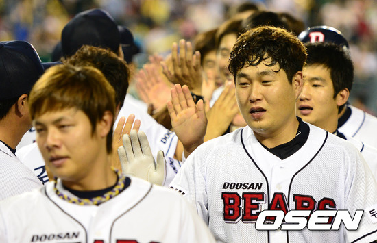 경기 종료 후 두산 양의지가 동료들과 승리의 기쁨을 나누고 있다. / sunday@osen.co.kr