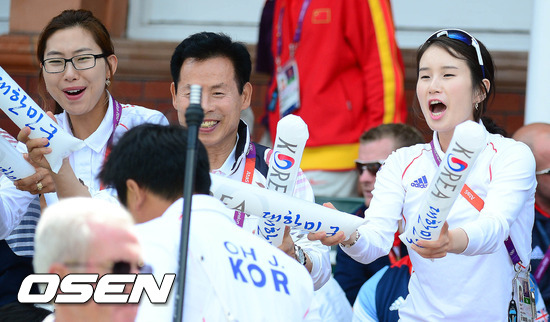 3일 밤(한국시간) 영국 런던의 로즈 크리켓 그라운드서 열린 '2012 런던 올림픽' 남자 양궁 개인 8강 경기에서 기보배가 오진혁을 응원하고 있다.