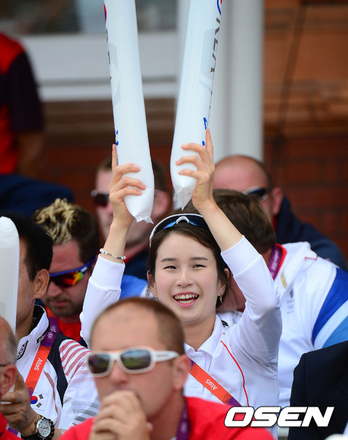 3일 밤(한국시간) 영국 런던의 로즈 크리켓 그라운드서 열린 '2012 런던 올림픽' 남자 양궁 개인 8강 경기에 오진혁과 김법민이 참가한 가운데, 기보배가 응원을 펼치고 있다.
