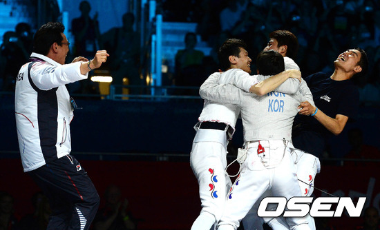 구본길(세계랭킹 4위) 원우영(8위) 김정환(11위) 후보 오은석(40위)으로 구성된 남자 사브르 대표팀(세계랭킹 5위)은 4일(이하 한국시간) 새벽 영국 런던 엑셀 경기장에서 열린 2012 런던올림픽 남자 사브르 단체전 결승전서 루마니아에 45-26으로 승리를 거뒀다.