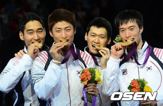 구본길(세계랭킹 4위) 원우영(8위) 김정환(11위) 후보 오은석(40위)으로 구성된 남자 사브르 대표팀(세계랭킹 5위)은 4일(이하 한국시간) 새벽 영국 런던 엑셀 경기장에서 열린 2012 런던올림픽 남자 사브르 단체전 결승전서 루마니아에 45-26으로 승리를 거뒀다. / jpnews@osen.co.kr