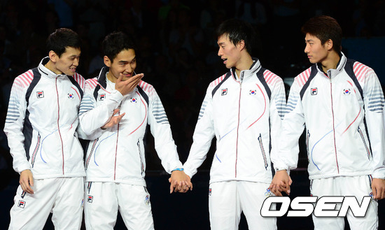 구본길(세계랭킹 4위) 원우영(8위) 김정환(11위) 후보 오은석(40위)으로 구성된 남자 사브르 대표팀(세계랭킹 5위)은 4일(이하 한국시간) 새벽 영국 런던 엑셀 경기장에서 열린 2012 런던올림픽 남자 사브르 단체전 결승전서 루마니아에 45-26으로 승리를 거뒀다. / jpnews@osen.co.kr