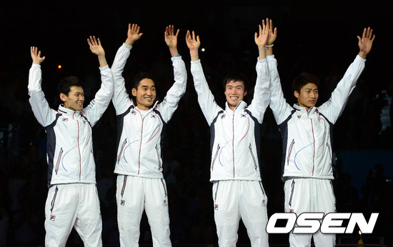 구본길(세계랭킹 4위) 원우영(8위) 김정환(11위) 후보 오은석(40위)으로 구성된 남자 사브르 대표팀(세계랭킹 5위)은 4일(이하 한국시간) 새벽 영국 런던 엑셀 경기장에서 열린 2012 런던올림픽 남자 사브르 단체전 결승전서 루마니아에 45-26으로 승리를 거뒀다. / jpnews@osen.co.kr