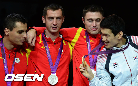 구본길(세계랭킹 4위) 원우영(8위) 김정환(11위) 후보 오은석(40위)으로 구성된 남자 사브르 대표팀(세계랭킹 5위)은 4일(이하 한국시간) 새벽 영국 런던 엑셀 경기장에서 열린 2012 런던올림픽 남자 사브르 단체전 결승전서 루마니아에 45-26으로 승리를 거뒀다. / jpnews@osen.co.kr