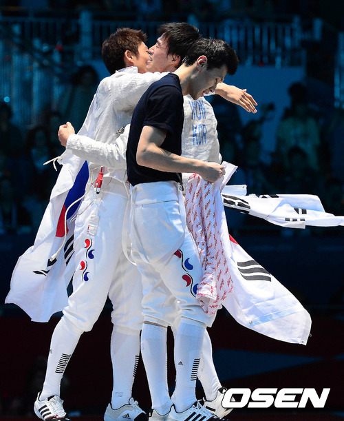 구본길(세계랭킹 4위) 원우영(8위) 김정환(11위) 후보 오은석(40위)으로 구성된 남자 사브르 대표팀(세계랭킹 5위)은 4일(이하 한국시간) 새벽 영국 런던 엑셀 경기장에서 열린 2012 런던올림픽 남자 사브르 단체전 결승전서 루마니아에 45-26으로 승리를 거뒀다. / jpnews@osen.co.kr