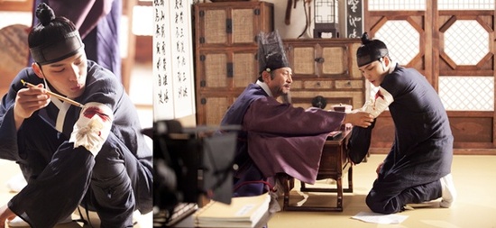 부상을 도드라지게 덧칠한 김재중은 촬영이 시작되자 응석 섞인 표정으로 아버지를 향해 팔을 내보이고, 김응수는 그런 아들을 걱정스럽고 안타까운 표정으로 바라보며 완벽한 연기호흡을 선보였다. 이어 막간을 이용해 아버지 등 뒤에서 귀여운 장난을 시도하다 발각된 김재중은 한껏 귀여운 표정으로 선배배우 김응수를 바라보며 아버지의 사랑을 듬뿍 받는 막내아들의 포스를 내뿜고 있다.