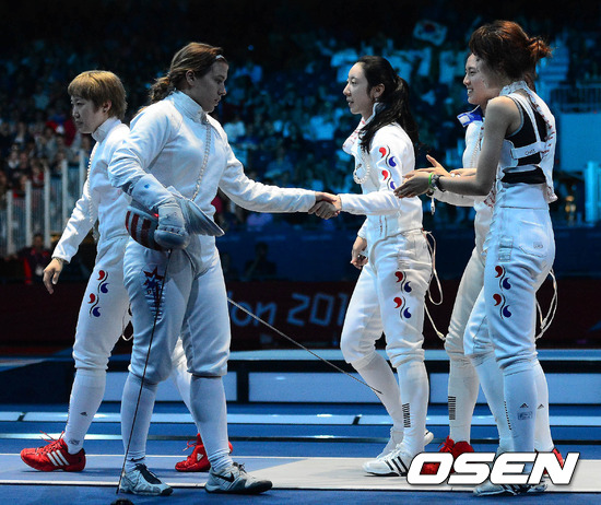 신아람과 정효정(28, 부산시청) 최인정(22, 계룡시청) 최은숙(26, 광주서구청)으로 구성된 여자 펜싱 에페 대표팀(세계랭킹 10위)은 4일(한국시간) 영국 런던 엑셀 사우스 아레나에서 열린 2012 런던올림픽 펜싱 여자단체 에페 준결승전에서 세계랭킹 5위 미국을 상대로 45-36 승리를 거두며 결승 진출에 성공했다. / jpnews@osen.co.kr
