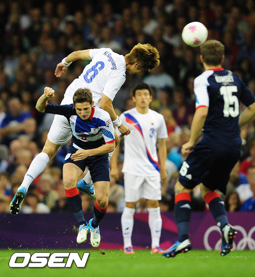 [OSEN=카디프(영국), 올림픽공동취재단] 5일(한국시간) 새벽 웨일즈 카디프시티의 밀레니엄 스타디움에서 열린 2012런던올림픽 남자축구 8강전 영국과의 경기 전반 기성용이 헤딩을 시도하고 있다.