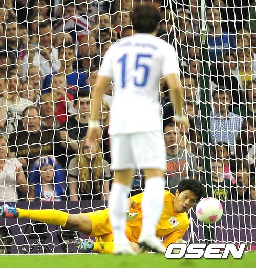 [OSEN=카디프(영국), 올림픽공동취재단] 5일(한국시간) 새벽 웨일즈 카디프시티의 밀레니엄 스타디움에서 열린 2012런던올림픽 남자축구 8강전을 영국과의 경기 전반 정성룡이 페널티킥을 막아내고 있다.