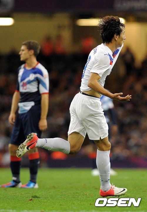 [OSEN=카디프(영국), 올림픽공동취재단] 5일(한국시간) 새벽 웨일즈 카디프시티의 밀레니엄 스타디움에서 열린 2012런던올림픽 남자축구 8강전을 영국과의 경기 지동원이 강력한 중거리 슛으로 선제골을 넣고 있다.