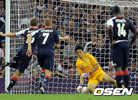 [OSEN=카디프(영국), 올림픽공동취재단] 5일(한국시간) 새벽 웨일즈 카디프시티의 밀레니엄 스타디움에서 열린 2012런던올림픽 남자축구 8강전을 영국과의 경기 전반 정성룡이 영국의 첫 페널티킥을 아쉽게 막지 못하고 있다.