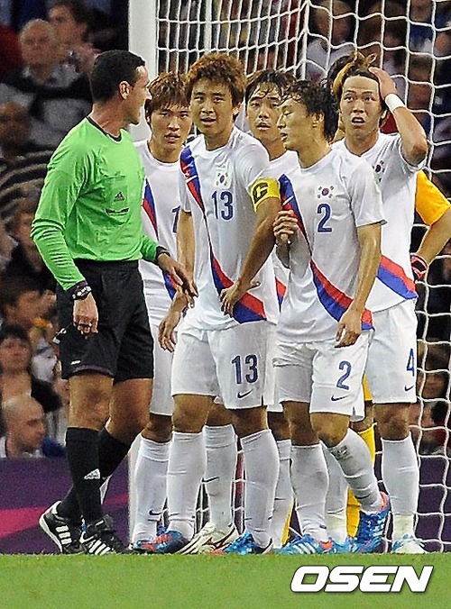[OSEN=카디프(영국), 올림픽공동취재단] 5일(한국시간) 새벽 웨일즈 카디프시티의 밀레니엄 스타디움에서 열린 2012런던올림픽 남자축구 8강전을 영국과의 경기 전반 주심의 페널티킥 선언에 구자철이 항의하고 있다.