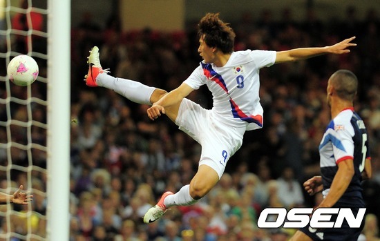 [OSEN=카디프(영국), 올림픽공동취재단] 5일(한국시간) 새벽 웨일즈 카디프시티의 밀레니엄 스타디움에서 열린 2012런던올림픽 남자축구 8강전을 영국과의 경기 후반 지동원이 공에 몸을 날리고 있다.