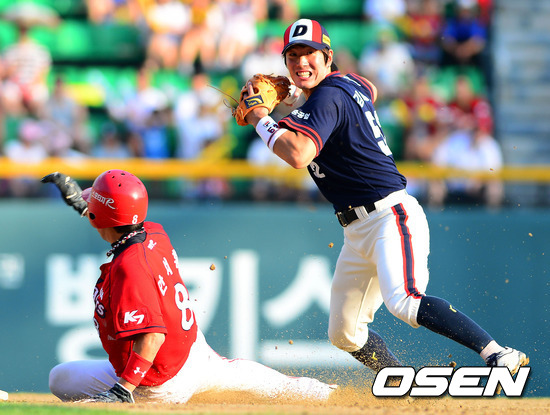 5일 오후 서울 잠실구장에 열린 '2012 팔도 프로야구' 두산 베어스와 KIA 타이거즈의 경기, 3회초 1사 1,3루 두산 김재호가 KIA 김원섭의 타구를 잡아 1루 주자 안치홍을 포스 아웃 시키고 1루로 송구하고 있다.