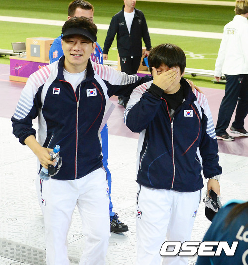 경기를 마치고 진종오가 눈물을 흘리는 최영래와 기쁨을 나누고 있다. /jpnews@osen.co.kr