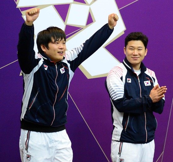 만세 부르는 최영래를 흐믓하게 쳐다보는 진종오