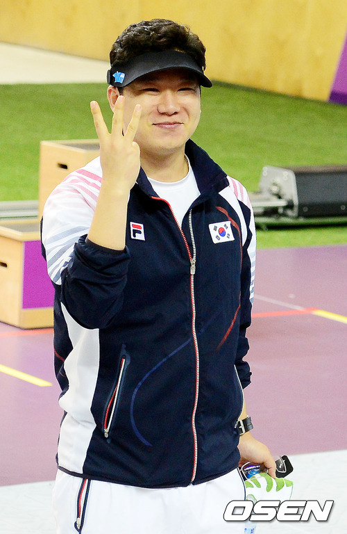 경기를 마치고 진종오가 베이징올림픽에서의 금메달과 런던 올림픽의 금메달 둘을 합쳐 손가락을 펼치고 있다. /jpnews@osen.co.kr