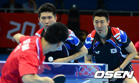 오상은-유승민조가 세 번째 복식 경기에서 첫 두 세트를 앞섰지만 나머지 세 세트에서 제대로 힘 써보지 못하고 2-3(11-6, 12-10, 1-11, 8-11, 7-11)으로 패했다.