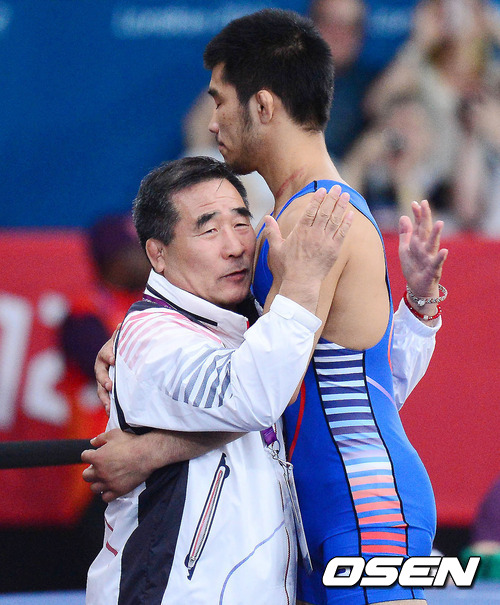 경기를 마치고 방대두 레슬링 감독이 최규진을 위로하고 있다. /jpnews@osen.co.kr