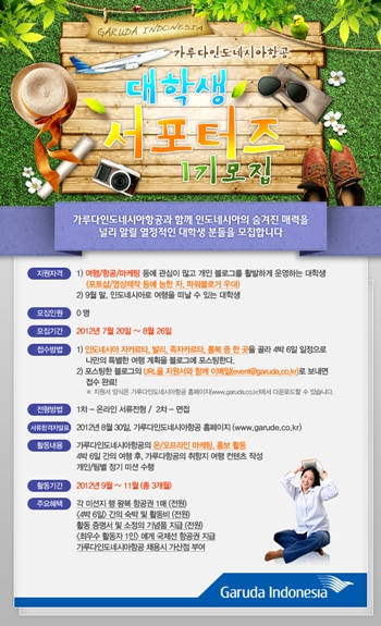 인도네시아 국영항공사 가루다인도네시아항공(www.garuda.co.kr)이 ‘대학생 서포터스’ 1기를 8월 26일까지 모집한다.